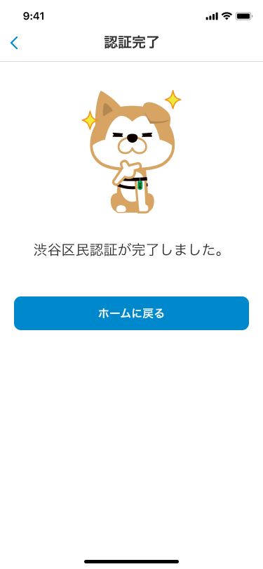正常に本人確認が終了すると下記画面が表示されます。ホームに戻るボタンをタップし先にお進みください。